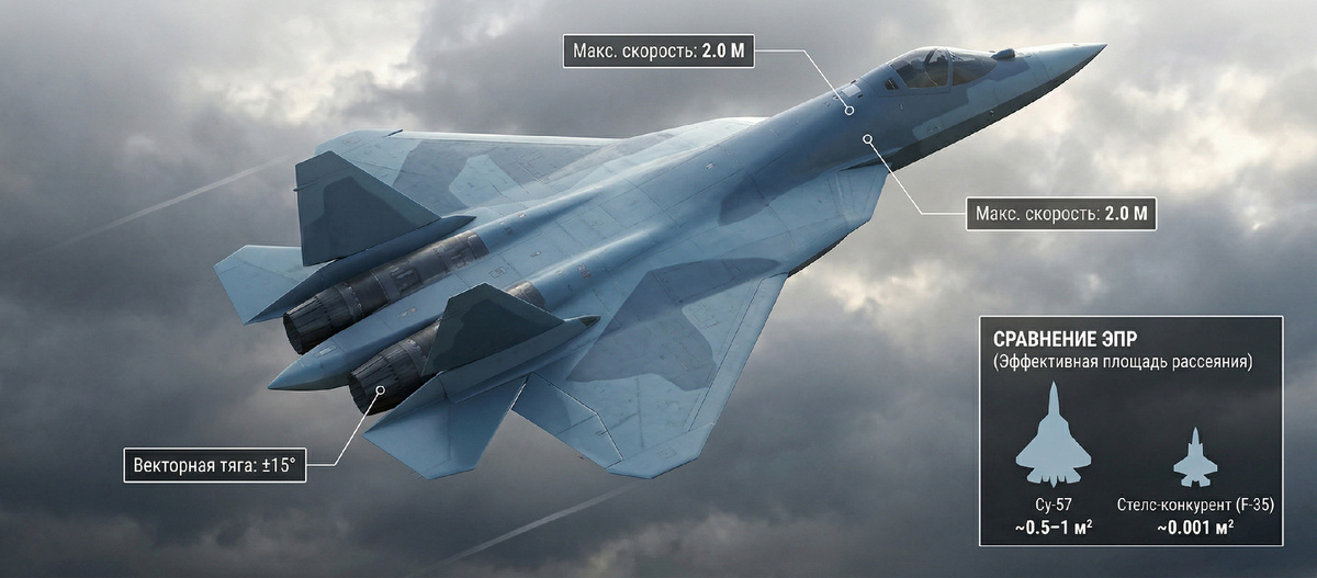 В российской концепции Су-57 часто рассматривается как авиационный командный пункт. Он не обязательно должен быть невидимым для всех радаров во всех режимах. Его задача — войти в зону боя, распределить цели между дронами, запустить ракеты большой дальности и уйти.