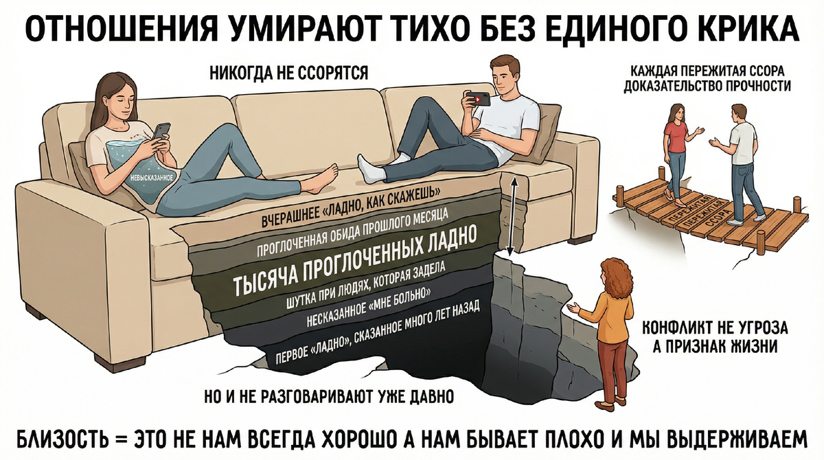 «Мы никогда не ссоримся» — говорите вы с гордостью. А потом добавляете тише: «Но мы и не разговариваем толком. Уже давно».