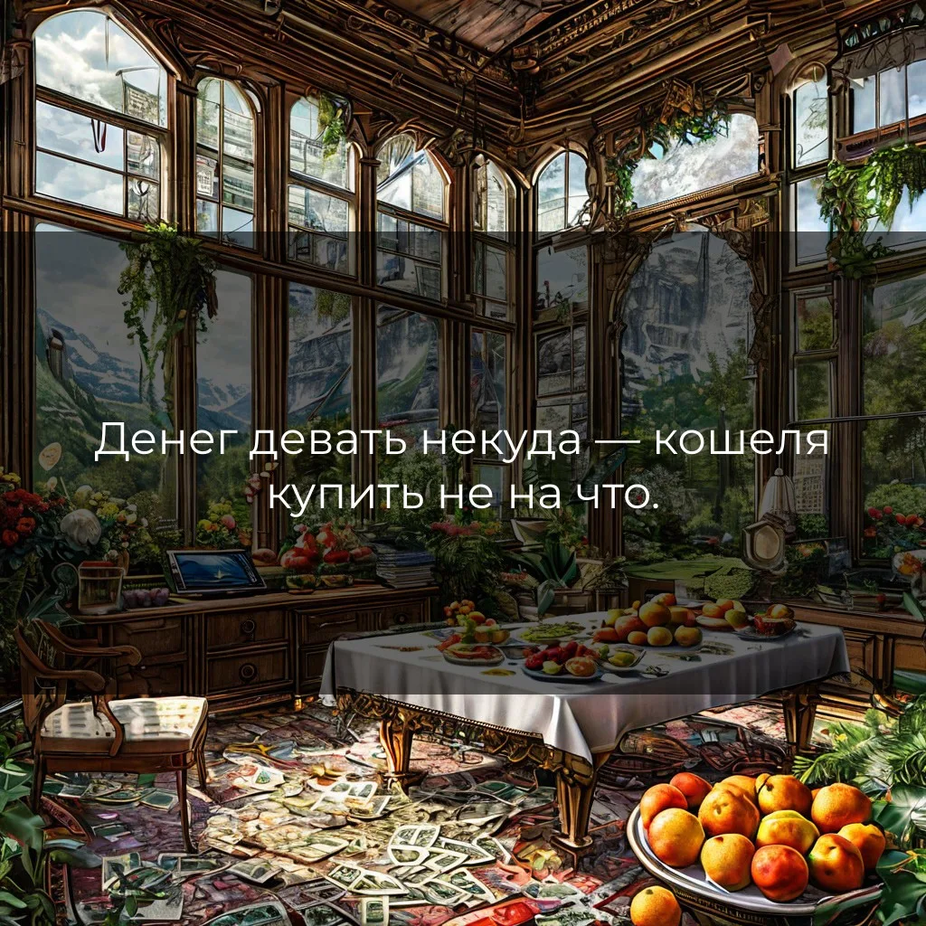 Представьте себе человека, который тонет в богатстве, но не может найти выхода из парадокса: изобилие душит его, а решение — простое и близкое — ускользает, как мираж в пустыне. Таков скрытый смысл этой народной мудрости. Она раскрывает драму изобилия без цели: когда ресурсов так много, что они теряют ценность, а человек, ослепленный ими, не видит, как применить их с толком. Это не просто насмешка над жадностью — это крик души о том, как легко заблудиться в достатке, если нет понимания, куда идти дальше. Когда эта фраза звучит в жизни? Вспомните ситуации, где кто-то жалуется на переизбыток, но вместо действия ищет оправдания. Допустим, сосед хвастается урожаем яблок — «девать некуда!» — но ленится сделать даже варенье, ссылаясь на отсутствие банок. Или коллега, заваленный деньгами, но вечно ноющий, что не может купить новую машину, потому что «выбрать не из чего». Это мудрость о тех, кто тонет в возможностях, но цепляется за пустые отговорки, лишь бы не шевелиться. Пример из быта: пред