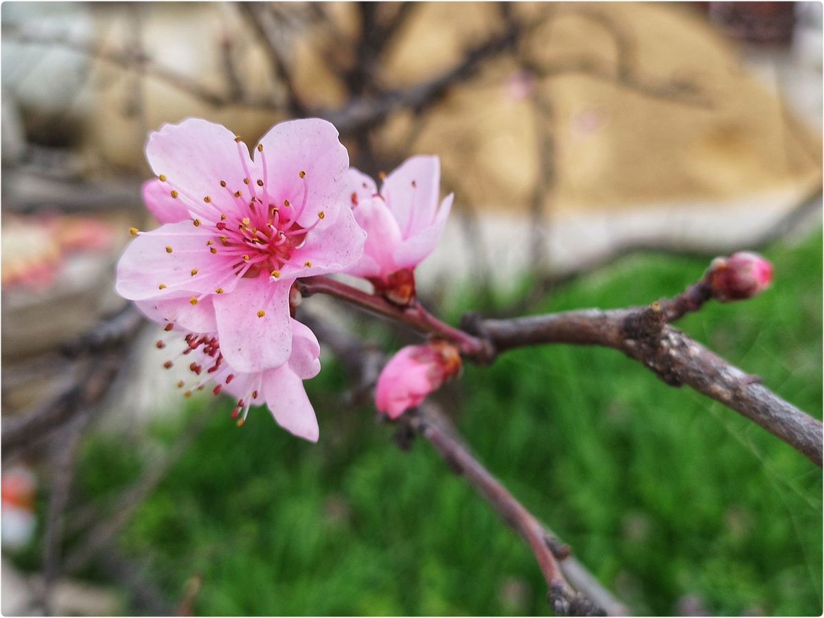 Цветёт персик всегда чуть-чуть позже абрикоса, но тоже до появления листьев. Поэтому розовые бутоны на голых ветках