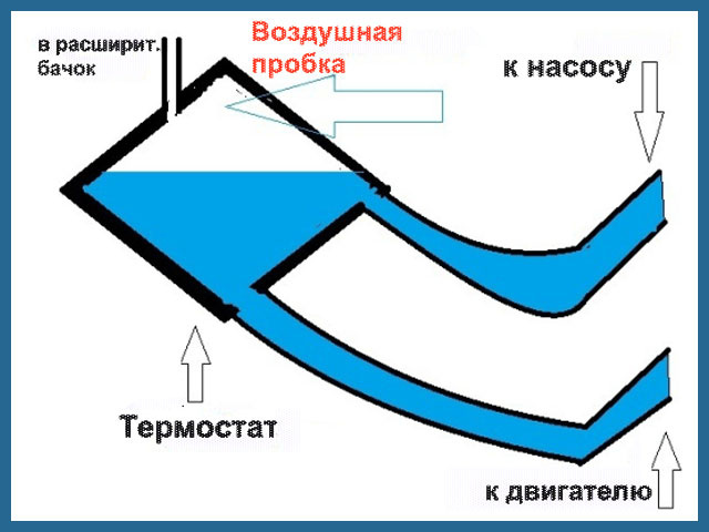 Бывают случаи, что двигатель, наоборот, прогревается медленно. Это может происходить из-за образования воздушной пробки в термостате.