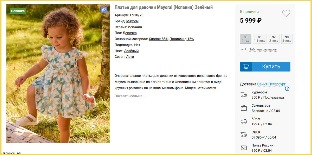 Меня преследует реклама одной конторы, которая продает детские вещи. Реклама - «яндекс-директ», ага. Все время удивляюсь неповоротливости этих рекламных кампаний. Я уже давно не интересуюсь этой конторой… а интересовалась – как потенциальным работодателем, да. А они мне суют и суют рекламу. Просто, я немного в курсе на ценники «директа»… Чуть позже я напишу подробности взаимодействия с компанией – зависит от того, чем все закончится. Они «тоpчат» мне денег, аж 4300 рублей. Вторая неделя пошла. С суммой согласились, документы по самозанятости стребовали. Вернее – я согласилась, именно с такой цифрой, хотя по расчетам выходило больше. Просто я хотела забыть об этих людях и их организации, как о страшном сне. Как можно скорее! Пока – вот просто, из той рекламы. Платье для малышки – столько стоит: 6000 руб + доставка Я пошла на наш любимый ВБ. В 10 раз меньше! Конечно, не Испания… НО. Смысл покупать годовалому ребенку платье за 6000? Через полгода оно будет малышке мало. За 6000 вполне мож