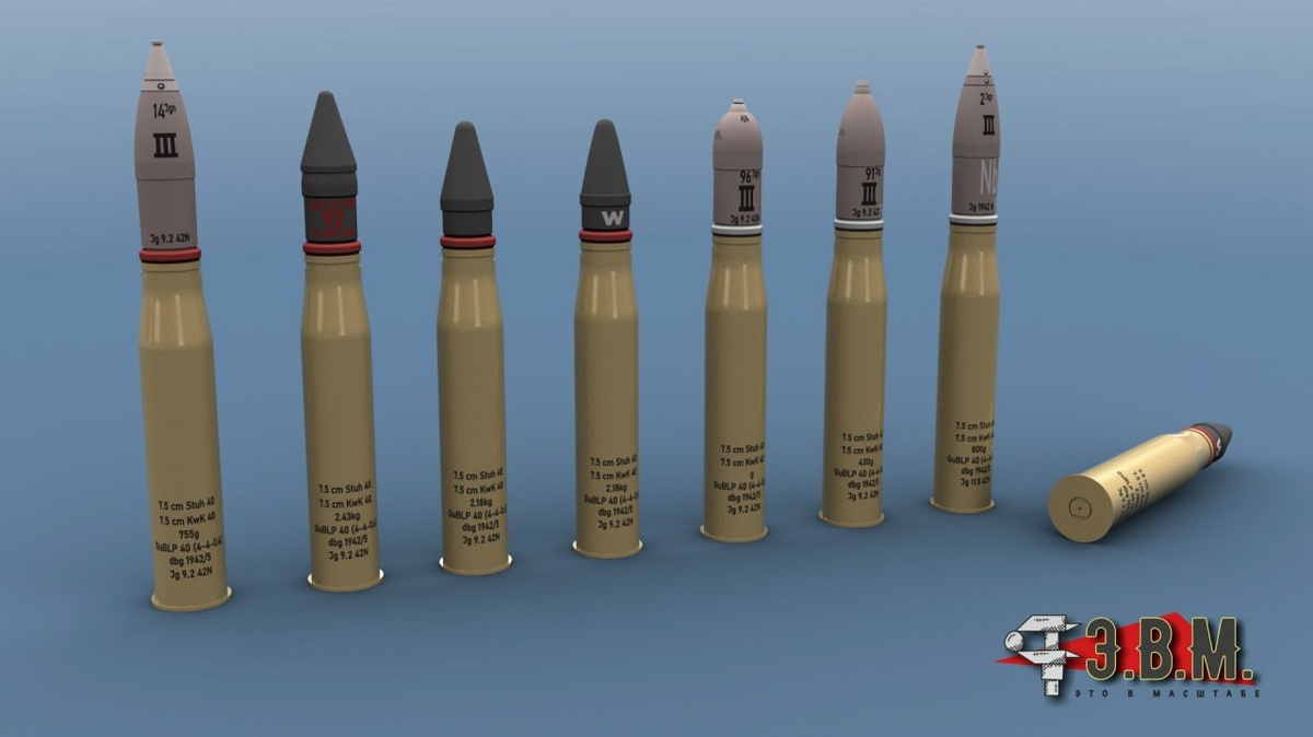 В.М. готовят к выпуску серию наборов немецких снарядов 7.5 cm Kw.K. 40 в масштабе 1/35: семь разных типов и их ассорти. Гильзы - точеные из латуни, снаряды - 3D-печать, донца - фототравление. К каждому виду снарядов - декали с соответствующей маркировкой. Kwk40 (Kampfwagenkanone 40) — самая распространенная немецкая танковая 75-мм пушка периода ВМВ с длиной ствола L/43 и L/48. Устанавливалась в качестве основного вооружения на средние танки Pz IV Ausf. F2, G, H, J. Вариант Stu.K. 40 применялся на САУ StuG III (начиная с Ausf. F) и StuG IV, а также на Jagdpanzer IV/48. Номенклатура боеприпасов включает бронебойные, подкалиберные, кумулятивные и осколочно-фугасные снаряды, отличающиеся формой головной части, конструкцией и маркировкой.