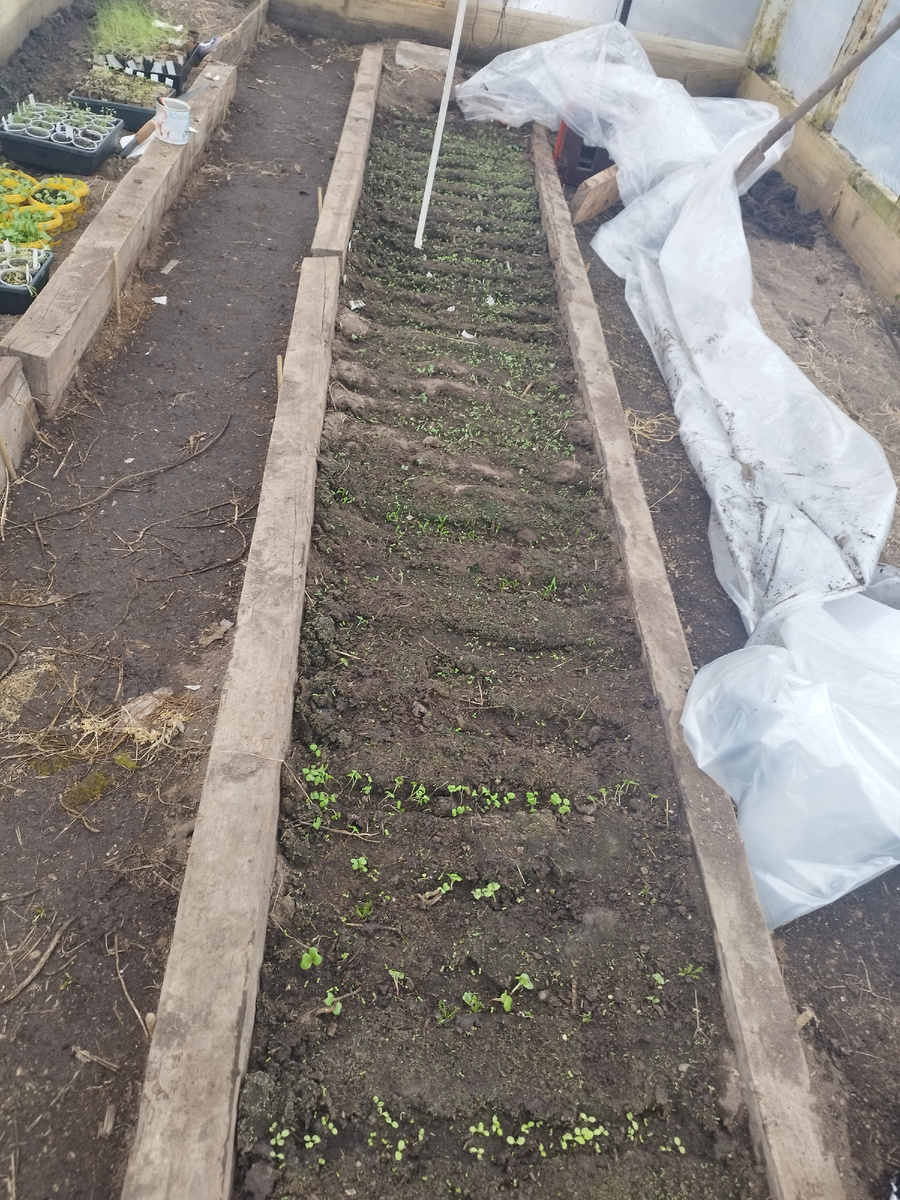 Эти дни было около +16, солнечно. Теплица закрыта, а грядка дополнительно закрыта полиэтиленовой плёнкой в