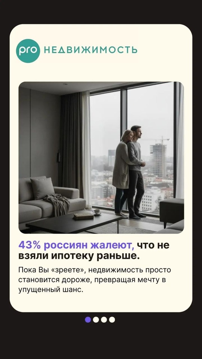 ?* Согласно свежей статистике, 43% людей старше 29 лет жалеют, что не взяли ипотеку раньше. То, что в 20 лет казалось «финансовой кабалой» и ограничением свободы, к 30 годам осознается как упущенный шанс купить недвижимость по адекватной цене. Возраст — лучший учитель. С годами ценность мобильности уступает место потребности в стабильном активе. Почему стоит действовать именно сейчас, а не ждать «идеального момента»?** - Фиксация стоимости. Недвижимость — это актив, который в долгосрочной перспективе только дорожает. Заходя в сделку сегодня, Вы замораживаете цену. - Капитализация. Пока Вы сомневаетесь, другие уже гасят основной долг, превращая аренду в собственность или создавая надёжный инвестиционный актив. - Льготные ипотеки и субсидии. Сейчас есть возможность взять ипотеку по низким ставкам. Возможно Вы подходите под одну из программ - не упускайте эту возможность Страх перед ипотекой в молодости — это страх перед ответственностью, который в будущем оборачивается реальными фина