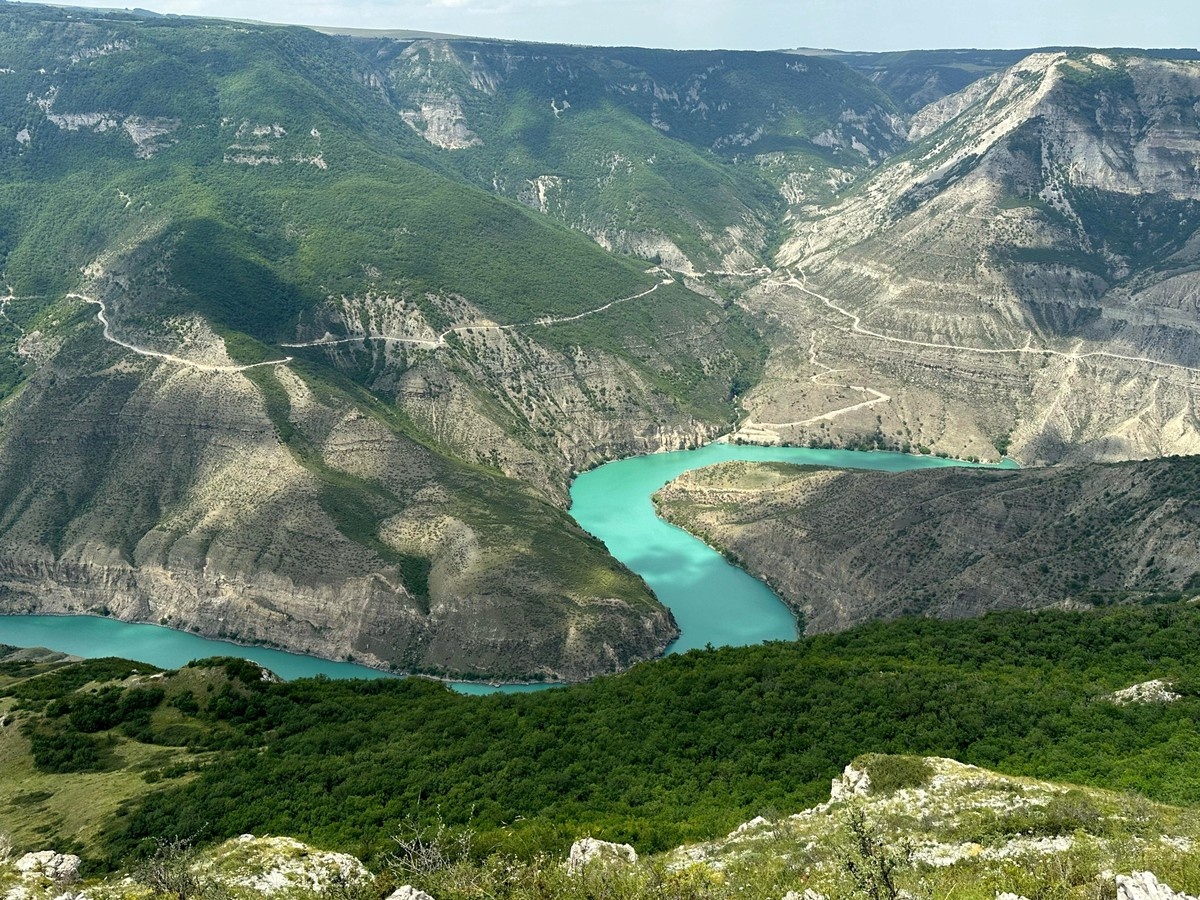 - Бирюзовую реку, нежно обнимающую скалы Сулака