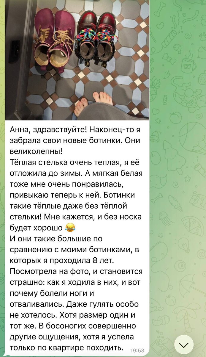 8 лет в одной обуви, тот же размер, но стоило надеть босоногие ботинки, и сразу стало понятно, почему раньше ноги уставали и гулять не хотелось. Потому что дело не в размере, а в том, сколько свободы у стопы на самом деле. И особенно приятно, что ботинки порадовали теплом, мягкостью внутри и комфортом даже без тёплой стельки. Такие отзывы лучше любых обещаний показывают, насколько разными могут быть ощущения в обуви. На фото босоногие ботинки Mary Размеры 36-46 Стоимость 18 990 руб Заказать на сайте alesvito.ru или у наших заботливых менеджеров @alesvito Бесплатная доставка по России Мы в МАХ