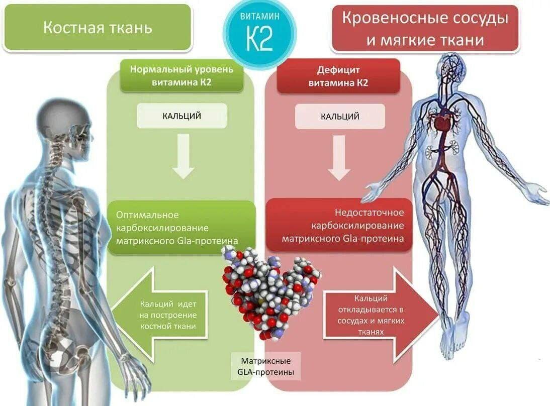 1⃣Здоровье костей 🩻 В комплексе с витамином D и кальцием витамин К2 играет решающую роль в вопросе здоровья костей, а также зубов. Именно он отвечает за регуляцию выработки белка остеокальцина, который связывается с кальцием и поддерживает минеральную плотность костной ткани. 2⃣Здоровье сердца и сосудов 🫀 Витамин К2 полезен для сердечно‑сосудистой системы, поскольку он участвует в производстве матриксных белков Gla‑протеина (MGP). Эти соединения помогают предотвратить образование атеросклеротических бляшек, кальцификацию артерий сердца.