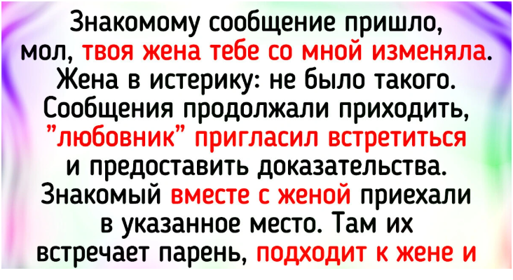 - Знакомому сообщение пришло, мол, твоя жена тебе со мной изменяла. Жена в истерику: не было такого. Сообщения продолжали приходить, "любовник" пригласил встретиться и предоставить доказательства. Знакомый вместе с женой приехали в указанное место. Там их встречает парень, подходит к жене и действительно предъявляет доказательства измены, вот только не ее, а ее муженька. Оказывается, знакомый мой водил шашни с женой этого парня, и вот обманутый муж придумал такую месть. © nummud