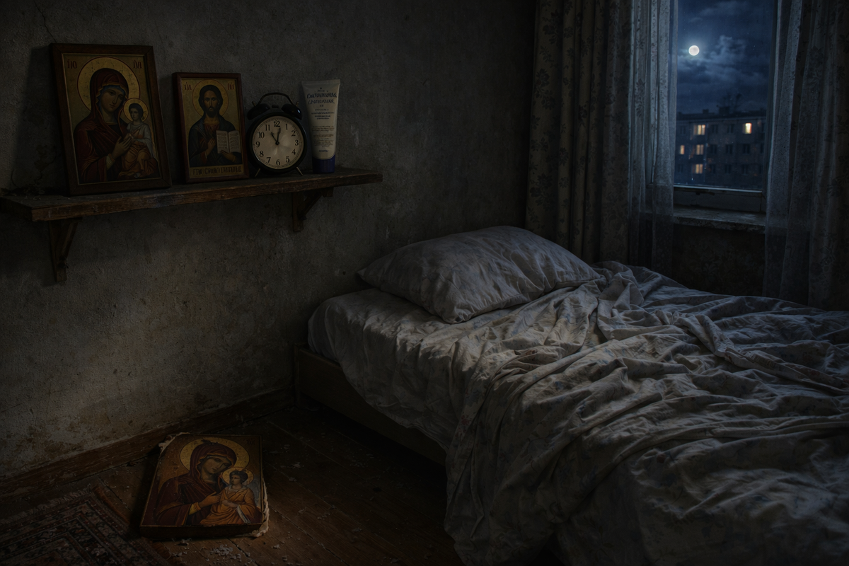 Над кроватью, на стене, полка. Узкая, деревянная, Вера Павловна сама прикручивала семь лет назад. На полке — две иконы, будильник, тюбик крема. Иконы стояли там с первого дня: Николай Угодник и Богородица. Богородица деревянная, тяжёлая, старая, ещё от бабки Веры Павловны.