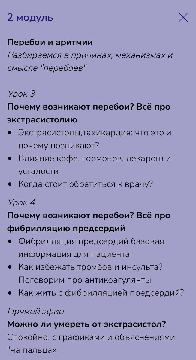 Перебои и аритмии “У меня перебои - это опасно?” Это один из самых частых вопросов на консультациях и в личке. И я понимаю почему: перебои ощущаются ярко, пугают, выбивают из жизни. Даже если формально “анализы нормальные”. Проблема в том, что большинство людей живут в режиме: симптом → страх → гугл → ещё больше страха → новые ощущения. Что даёт Модуль 2 В этом модуле мы разбираем аритмии так, чтобы вы перестали “думать наугад” и начали понимать логику. ✅ Что такое экстрасистолы, тахикардия, паузы и почему они ощущаются как “удар/провал/переворот” ✅ Почему кофе, недосып, стресс, гормоны, усталость реально усиливают симптомы ✅ Когда достаточно наблюдения, а когда нужен Холтер/ЭхоКГ/анализы ✅ Красные флаги, при которых лучше не тянуть и обратиться к врачу Главный эффект Вы перестаёте воспринимать каждую “волну” в груди как угрозу и начинаете действовать по алгоритму. А когда есть алгоритм, то тревога снижается, и симптомы часто ощущаются слабее. ⚠️ Важно: сейчас уже нет возможности