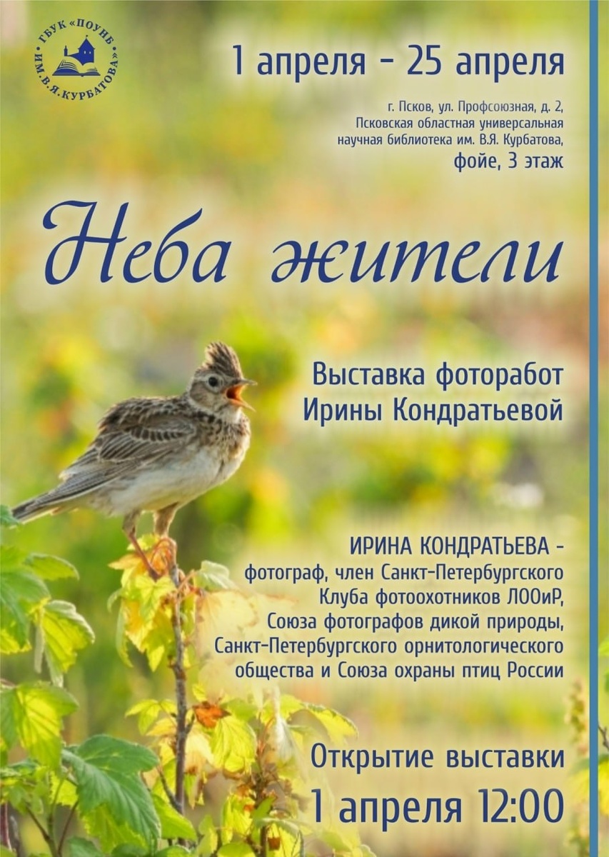 " Псковская областная универсальная научная библиотека имени В. Я. Курбатова приглашает на открытие фотовыставки "Неба жители", которое состоится 1 апреля в 12:00 в фойе 3-го этажа (ул. Профсоюзная, 2). В экспозиции представлены снимки птиц, сделанные известным фотографом-анималистом Ириной Кондратьевой. Автор — член Санкт-Петербургского Клуба фотоохотников ЛООиР, Союза фотографов дикой природы Санкт-Петербургского орнитологического общества и Союза охраны птиц России. В ее работах запечатлены удивительные моменты из жизни пернатых, переданные с большим мастерством и любовью к природе. Выставка будет работать с 1 по 25 апреля. Приглашаются все желающие познакомиться с красотой окружающего мира через объектив талантливого фотографа. Фото: областная библиотека
