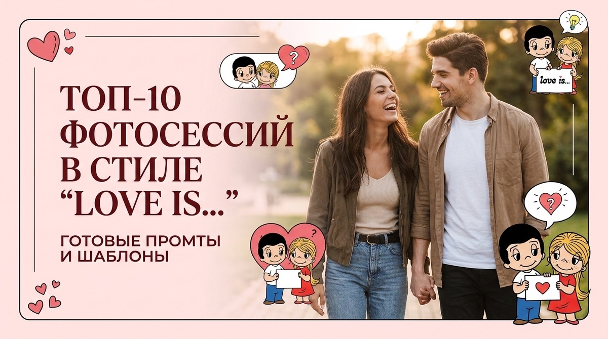 В 2026 году в моду снова вернулись винтажные вкладыши в стиле Love is - нежные, ироничные и очень трогательные мини‑истории о любви. Через Gemini можно превратить обычное фото пары в настоящий “вкладыш” из старого комикса: достаточно загрузить своё фото, а нейросеть сама добавит нужный шрифт, фон, атмосферу и нужную надпись. Всё уже подготовлено в виде готовых шаблонов: вы не пишете промт вручную, просто переходите по ссылке, вставляете фото и получаете готовый кадр. Ниже - 10 лучших идей в стиле Love is для пар.