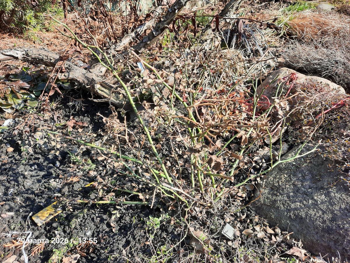 Ну вот и закончилась зима для розочек. Я начала снимать кое-где укрытие, в других местах открыла по сторонам для проветривания. Заодно оценила их первоначальное состояние. Хочу показать. Стоит сказать, что укрытие у меня жесткое. Крыша не прогибается в принципе. На ней клеенка крышей, без боковин. Потом нетканка в несколько слоев местами, где то поменьше, где то побольше. Это маленькая почвопокровная роза. Я сняла с нее укрытие совсем, иначе она сварится на солнце. Кое что потом почикала и все. Немного. Это совсем крошка. Недоглядела, не очень резкая фотография. Часть веток придется порезать. Пока прикрыла ящиком. Соседка вроде в порядке. На удивление, сильно набухших почек практически нигде нет. Хотя, чему удивляться! Март еще не закончился! Эта парочка тоже в порядке. Вроде как... Хотя на большом экране (редактирую по приезде)Видно, что правая так себе выглядит. ПРидется порезать основательно. Здесь все в порядке. Вообще все мелкие розочки в нормальном состоянии. Даже мамины, пос