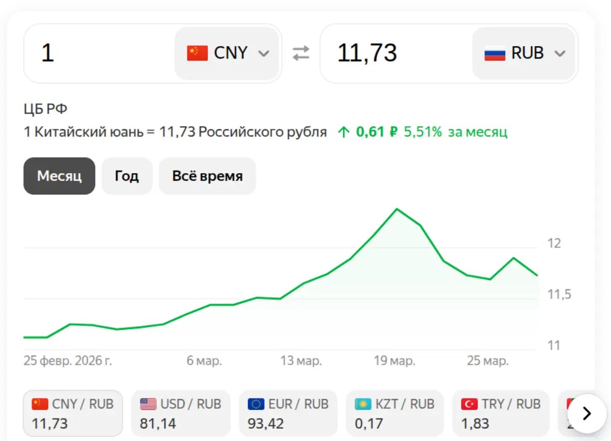 Курс китайского юаня по отношению к рублю сохранил стабильность. По данным на 29 марта 2026 года, стоимость 1 юаня осталась на уровне 11,73 рубля — без изменений по сравнению с предыдущим днем. Отсутствие динамики указывает на баланс спроса и предложения на валютном рынке. В последние годы юань занимает все более заметную роль во внешнеэкономических расчетах России, что делает его курс более устойчивым к краткосрочным колебаниям. Стабильность также может быть связана с относительно спокойной ситуацией на сырьевых рынках и отсутствием резких изменений в денежно-кредитной политике ключевых стран. Кроме того, на курс влияет структура внешней торговли, где расчеты в юанях продолжают расширяться. ❞«Юань постепенно укрепляет позиции в международных расчетах, что снижает его волатильность на отдельных рынках», — отмечают финансовые аналитики. В краткосрочной перспективе курс юаня к рублю, вероятно, останется в узком диапазоне. Существенные изменения возможны при резких колебаниях цен на сырье