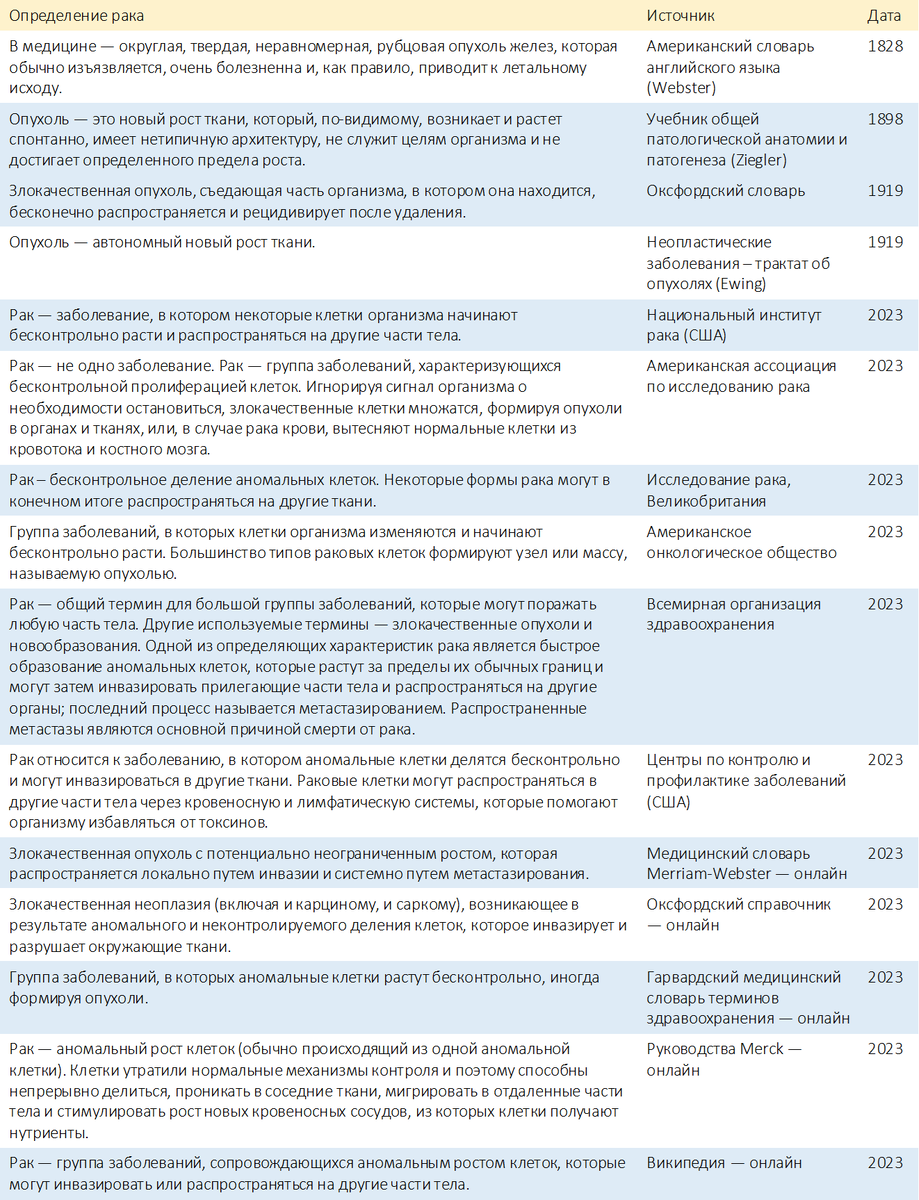 Таблица 1. Избирательные определения рака (для реф см. Brown JS, Amend SR, Austin RH, Gatenby RA, Hammarlund EU, Pienta KJ. Mol Cancer Res. 2023 Nov 1;21(11):1142-1147. doi: 10.1158/1541-7786.MCR-23-0411)