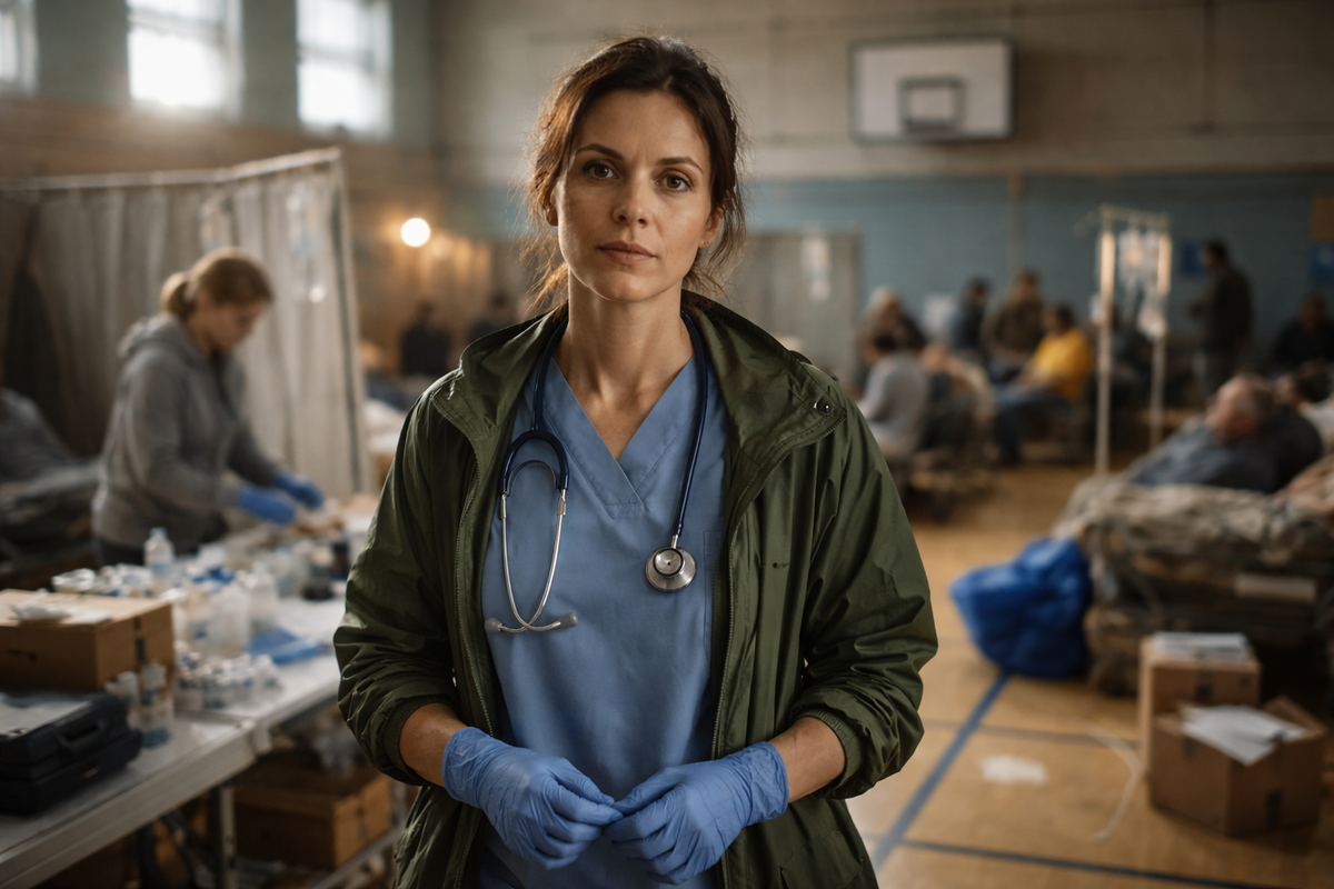Под потолком дрожали белые лампы, на полу тянулись влажные следы, пахло йодом, мокрой фанерой и брезентом. У стены сидел пожилой мужчина с перевязанной ладонью, у окна дремал мальчик в чужой куртке, а в центре зала, среди коробок с бинтами и пластиковых стульев, Арина уже вторые сутки держала этот временный медпункт на своих плечах. Она не считала, сколько раз за день вымыла руки, сколько кружек чая остыло у неё на столе и сколько раз рация захрипела одним и тем же голосом. Считать такие вещи бессмысленно, когда большая весенняя вода идёт по улице, как по коридору.