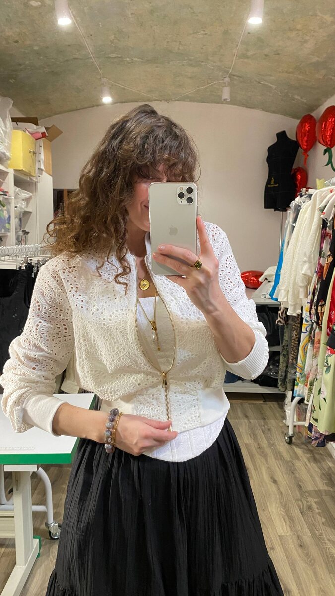 Прелесть номер два: легкий перфорированный бомбер из хлопкового шитья, идеальное дополнение к воздушным летним образам, в наличии