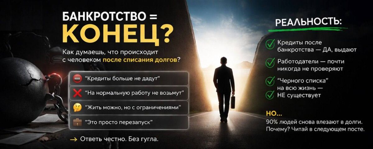 : После процедуры банкротства: ✔ Кредиты реально выдают (через 3–12 месяцев, иногда раньше) ✔ Банки сами предлагают карты и лимиты ✔ Работодатели в 99% случаев вообще не проверяют этот статус ✔ Вы НЕ становитесь «в черном списке на всю жизнь» Но есть нюанс, о котором молчат «эксперты»: 👉 Банкротство — это не просто списание долгов. Это обнуление кредитной модели поведения. Если человек снова идет в хаос — долги возвращаются. Если включает голову — начинает жить сильно стабильнее, чем ДО. ⚡ Парадокс: Люди с долгами на 1–3 млн выглядят «нормальными» для банков, а человек после банкротства — часто более надежный, потому что уже прошел дно и пересобрал систему. Хочешь — разберем твою ситуацию и скажу: стоит ли тебе вообще идти в банкротство или есть вариант лучше? Пиши в личку.