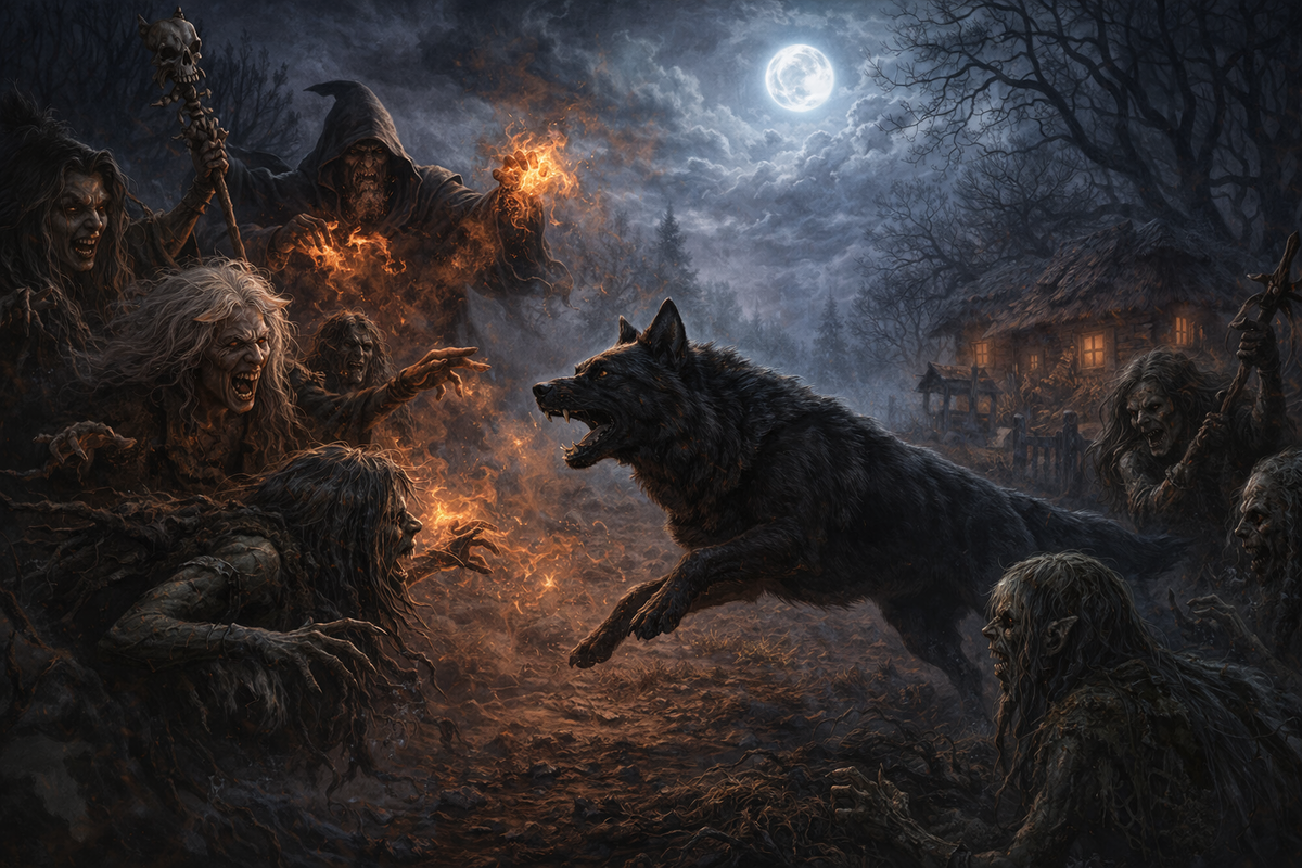 Это образ восточнославянской пограничной культуры, где дом постоянно соседствует с лесом, ночь — с угрозой, а животное — с тайным знанием. Пёс с волчьими зубами, которого боится ведьма, — это очень точная формула такой цивилизации. Здесь ещё не исчезла граница между видимым и невидимым. Здесь человек не одинок: рядом с ним есть живое существо, которое чувствует опасность раньше него.