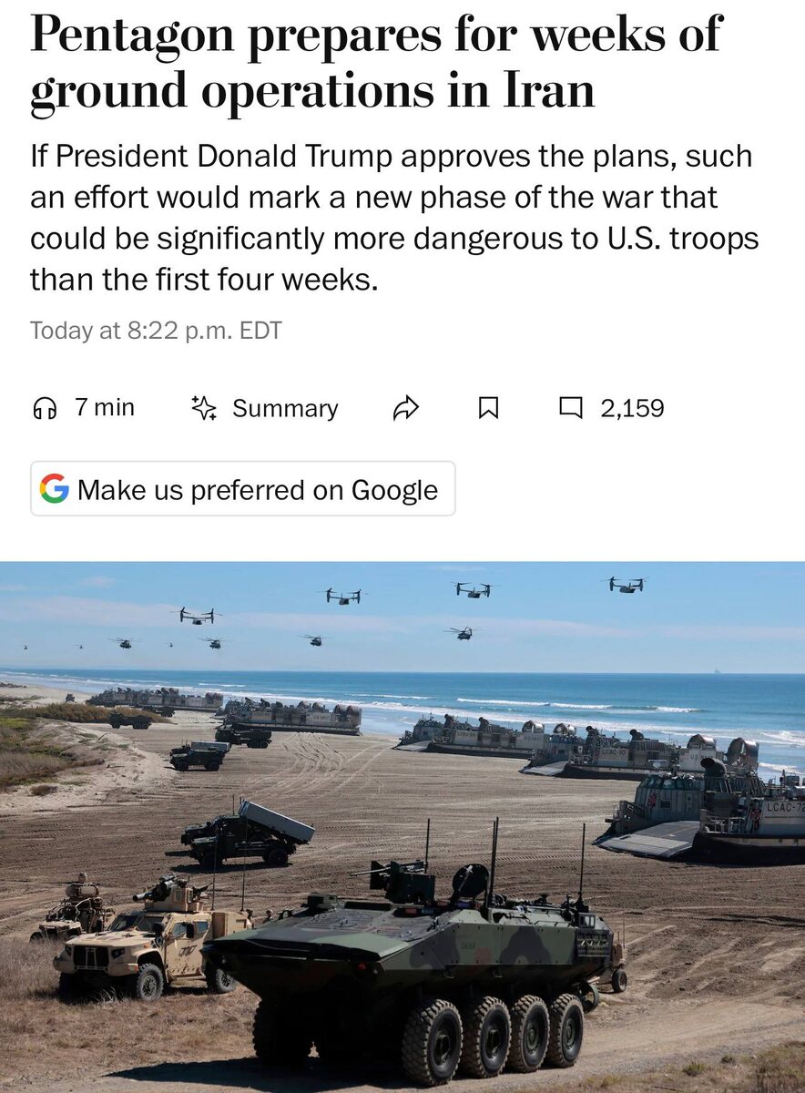 США готовятся к многонедельным наземным операциям в Иране, представляющим собой рейды спецподразделений и пехотных подразделений, сообщает The Washington Post. В ходе обсуждений в администрации в течение последнего месяца поднимался вопрос о возможном захвате острова Харк, а также о рейдах в другие прибрежные районы вблизи Ормузского пролива с целью поиска и уничтожения вооружения, которое может быть использовано для нанесения ударов по коммерческим судам и военным кораблям. Марко Рубио в пятницу заявил журналистам, что «это не будет затяжным конфликтом». Он привёл часто повторяемую, хотя и расплывчатую, оценку администрации о том, что операция идёт с опережением графика, и сказал, что США «могут достичь всех своих целей без участия сухопутных войск». Комментарии Рубио прозвучали после публикации Axios, в которой говорилось, что Пентагон готовит «последний удар» по Ирану, который может включать в себя как наземные операции, так и массированные удары. Axios и WSJ в последние дни так