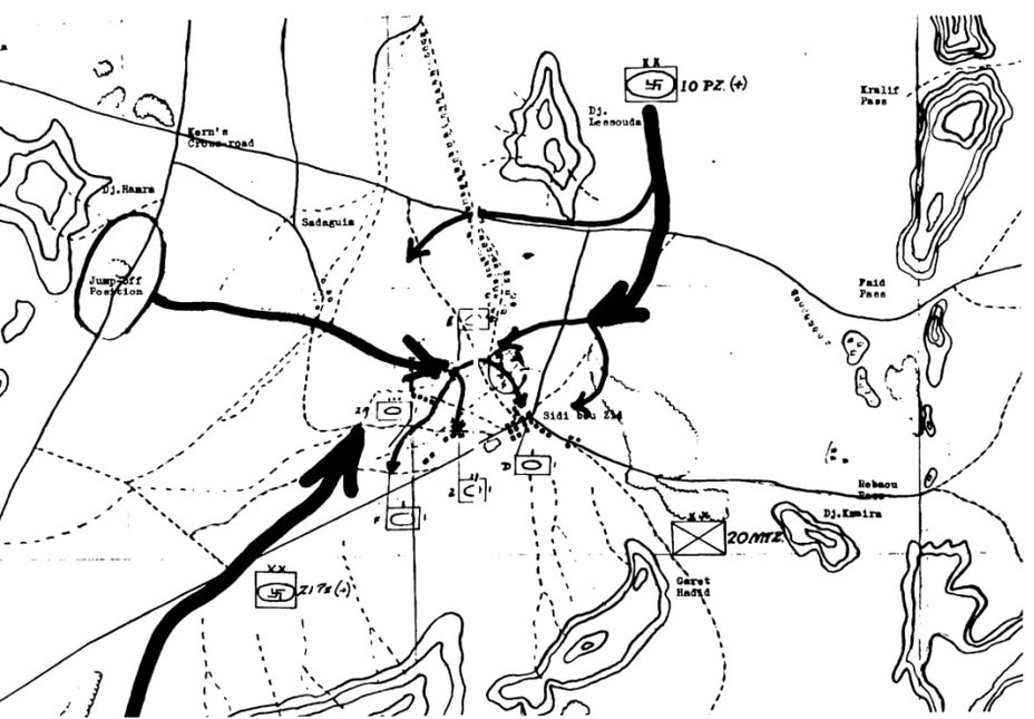 14 февраля 1943 года американские войска на Кассеринском перевале столкнулись с жестокой реальностью войны в Северной Африке. В этот день четыре немецкие боевые группы, включавшие танки и самоходные артиллерийские установки общей численностью около 140 единиц, внезапно атаковали позиции американцев у арабского населённого пункта Сиди-Бу-Зид. Оборону держали подразделения 168-й полковой боевой группы 34-й пехотной дивизии США, а также «Боевой отряд А» 1-й бронетанковой дивизии. К концу дня ситуация для американцев стала катастрофической: 168-я пехотная бригада и «Боевой отряд А» были полностью разгромлены. Потери американских танков достигли ужасающих 44 единиц, а отступление составило почти 24 километра. В битве за Джебель Лессуда под немецкий плен попал подполковник Уорд, зять генерала Паттона. Не смирившись с поражением, в ночь на 15 февраля генерал-майор Орландо Уорд, командующий 1-й бронетанковой дивизией, попытался организовать контратаку силами 2-го танкового батальона 1-го танко
