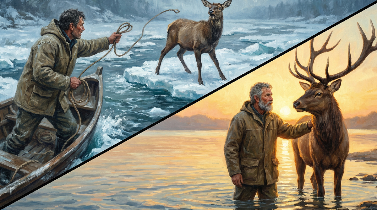 Семен замер, оценивая ситуацию. Льдину с оленем неумолимо несло к порогам, где вода кипела белой пеной, и где шансов выжить не было даже у лодки, не то что у зверя. В этот момент к берегу подошел сосед Семена, старый охотник Иван Кузьмич, тоже вышедший посмотреть на ледоход.