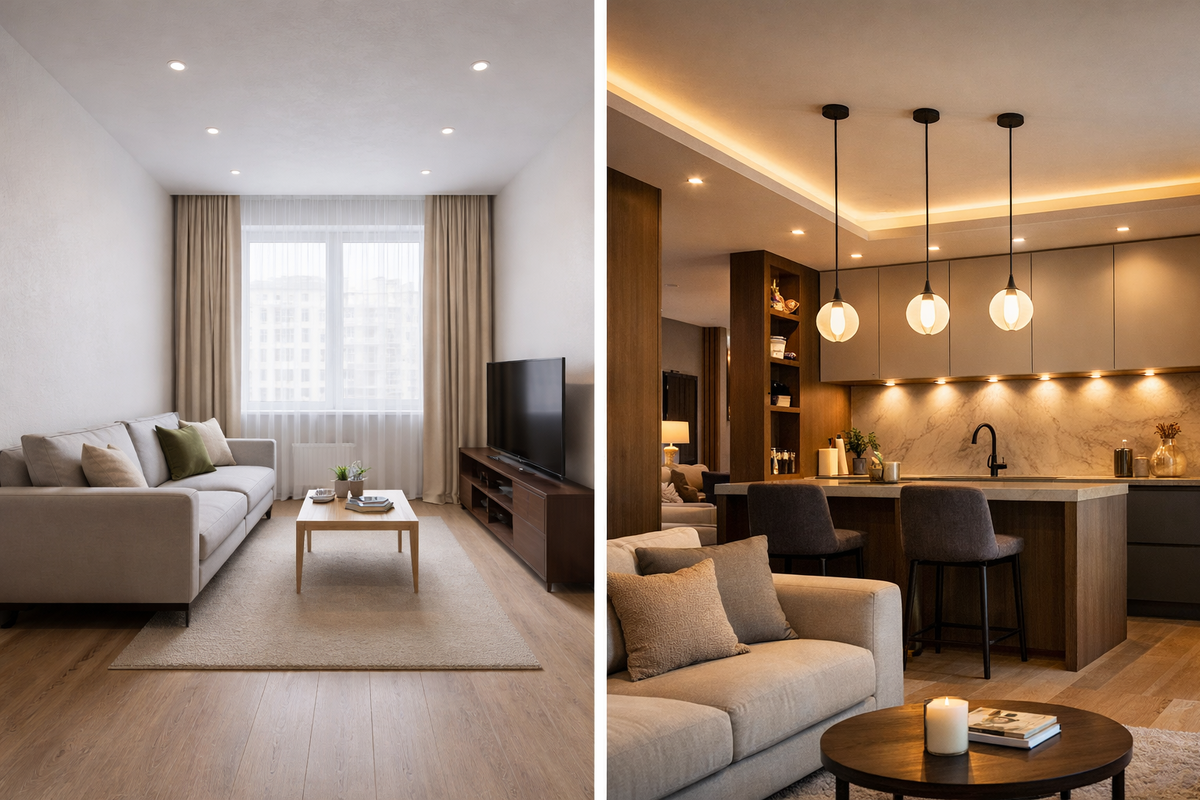 Иногда достаточно: отказаться от глянца, убрать перегруженную конструкцию, поменять логику света, сделать потолок спокойнее.