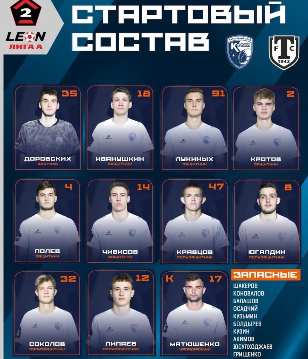 «Калуга» начинает матч 5-го тура Второй лиги (дивизион А, золото) против «Торпедо» из Миасса. Команды вышли на поле в следующих составах: «Калуга»: Доровских, Полев, Кротов, Лукиных, Иванушкин, Югалдин, Чибисов, Кравцов, Липаев, Соколов, Матюшенко. «Торпедо Миасс»: Ковалев, Кузьмин, Лопатько, Ткачук, Столбов, Павлов, Горовых, Борисенко, Файзуллин, Тарасов, Рубанов. Следите за результатами игры на нашем сайте. 0+