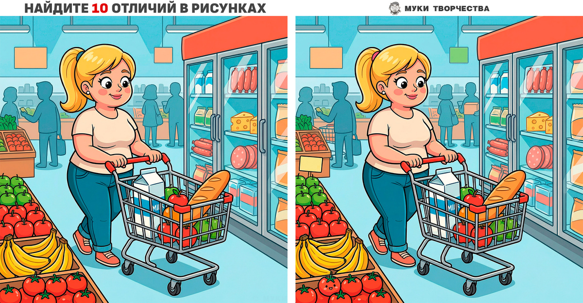 Перед вами две похожие картинки с девушкой в магазине. Она покупает продукты на вкусное блюдо, которым хочет удивить мужа, когда он вернётся вечером с работы. На этих картинках художник аккуратно сделал 10 отличий. Ваша задача - найти все отличия. Это не просто развлечение. Это полезное упражнение на развитие мозга. Оно улучшает концентрацию внимания и память. Подписывайтесь на канал «Муки творчества». Тут я стараюсь каждый день выкладывать новые задания на внимательность. В конце статьи будет ответ-подсказка для сверки своих предположений. ВкусВилл - сеть магазинов продуктов для здорового питания. Реклама: АО «Вкусвилл» ИНН: 7734443270 Горизонтальная версия: Покупки Вертикальная версия: Покупки Тут есть ещё задачки: ОТВЕТ (подсказка):