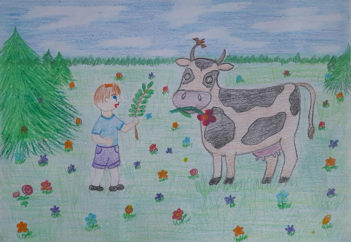 Описание работы: Стихотворение Н. Рубцова «Мальчик Вова» - шуточное. Свой рисунок я выполнила цветными карандашами. Корову мне захотелось изобразить доброжелательной. Она держит во рту цветок, который хотела подарить мальчику. Но Вова не понял и прогонял корову, а она не уходила.