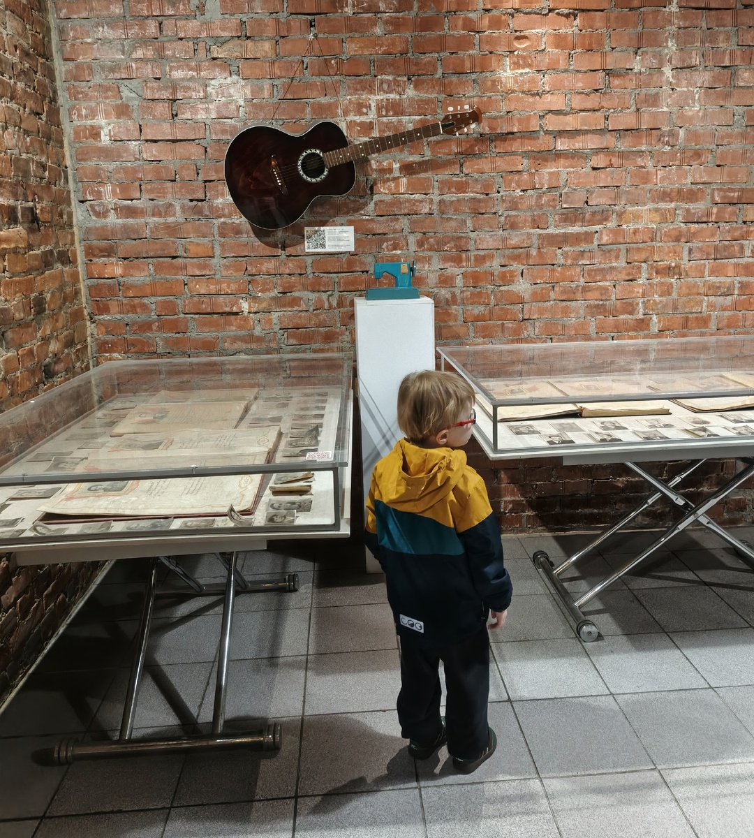 Вместо неспешного и спокойного рассматривания картин и сюжетов Малыш решил устроить нам марафон. Его заинтересовали только кирпичи, так как в некоторых местах Артмузы присутствует стиль Лофт; гитара на стене, указывающая на то, что раньше в помещении было производство "Муздеталь"; и какие-то большие бочки жёлтого цвета литров на 50 для хранения красок.