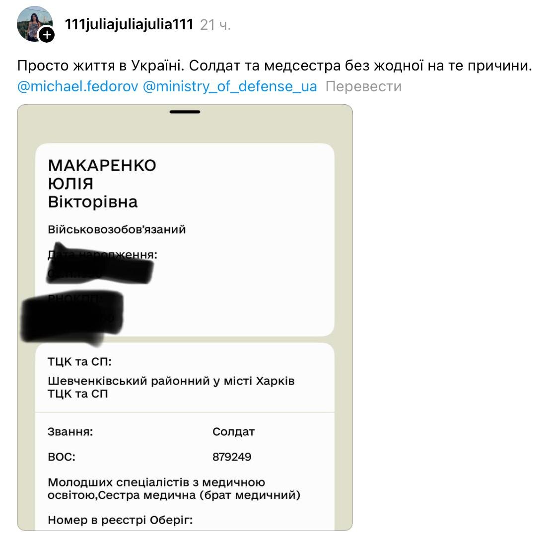 В Харькове ТЦК объявил в розыск ещё одну женщину Она написала пост и опубликовала скриншот из приложения «Резерв+», где её статус изменён на военнообязанную медсестру. По её словам, у неё нет медицинского образования и оснований для такой записи. В комментариях один из пользователей написал, что у женщины было четыре года, чтобы выбрать подразделение для службы. Он посоветовал не тянуть, уточнив, что можно избежать «бусика ТЦК» и «мясной» бригады. В ответ на упоминание о том, что у девушке нет медицинского образования он заявил, что её обучат, и через месяц она станет «хорошей медсестрой или кухаркой». Сайт "Другая Украина" / Telegram / Вконтакте / Центр поддержки Украинцев "Другая Украина" теперь в МАХ