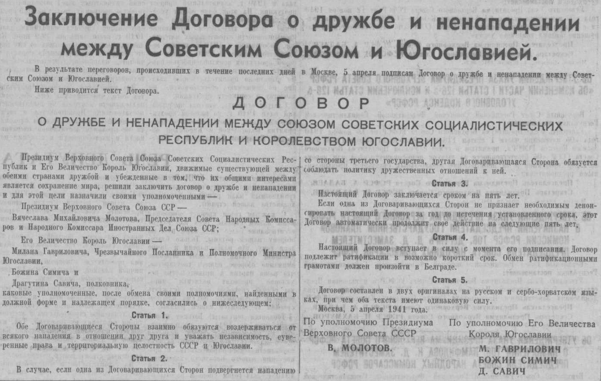 * СССР и Югославия подписали договор о дружбе и ненападении, который практически ничего Югославии не давал, а лишь выражал протест СССР против захватнической политики Германии на Балканах (напомним, - все еще союзной Германии и на Балканах - в районе «интересов» Москвы; еще на переговорах с Гитлером в Берлине Молотов настаивал не распространять войну на Балканы). Советское правительство тут же информировало посла Германии Шуленбурга о факте подписания договора, и тот телеграфировал в Берлин: Сталин надеется, что упреждающий шаг убедит германское правительство сделать «в своих отношениях с Югославией все возможное для поддержания мира». Советско-югославский договор предусматривал политику дружественных отношений в случае, если одна из договаривающихся сторон подвергнется нападению. Ранним утром 6 апреля, когда в Москве только что закончился банкет по случаю подписания договора, Германия напала на Югославию. Советский Союз не шелохнулся. Единственным шагом было сообщение Наркомата иностранных дел от 13 апреля, в котором осуждалась агрессия Венгрии, присоединившейся 11 апреля к нападению на Югославию.