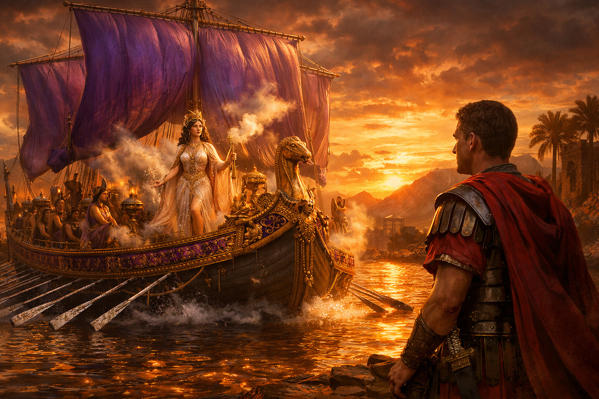 Пурпурные паруса, серебряные вёсла, облака благовоний над водой. Баржа скользит по реке Кидн навстречу римскому полководцу, и вся Киликия пахнет нардом и миррой. На палубе — женщина, одетая Афродитой. Ей двадцать восемь. Через тринадцать лет она выберет смерть — но сейчас она выбирает Марка Антония. Последний акт трёхтысячелетней пьесы начался с аромата духов. Клеопатра VII не была красавицей — так пишут те, кто её видел. Монеты с её профилем показывают крупный нос и острый подбородок. Но каждый, кто оказывался рядом, попадал под её власть мгновенно. Плутарх описывал: обаяние, голос, ум — вот её оружие. Девять языков. Египетский, греческий, латынь, арамейский, эфиопский, мидийский, парфянский и ещё несколько — она говорила с каждым послом на его родном наречии. Первая из династии Птолемеев за триста лет, кто выучил египетский. Её предки — македонские греки, потомки полководца Александра — считали местный язык варварским. Она говорила на нём с крестьянами, жрецами и солдатами. И они люб