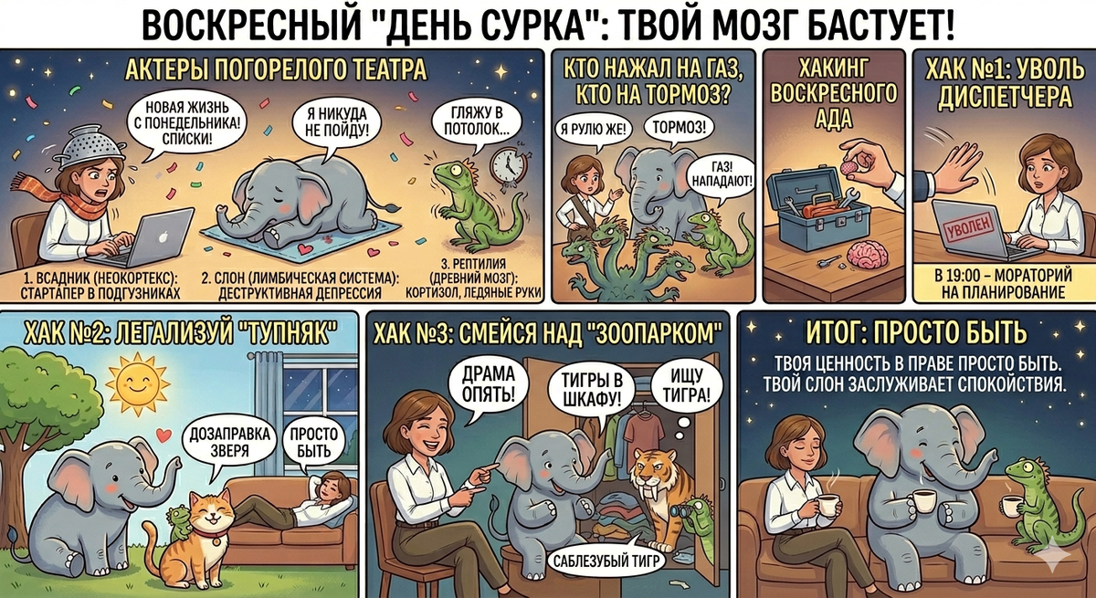 Оказывается, и те, кто в списке Forbes, и те, кто на гречке, сидят в одной лодке и смотрят, как их жизнь проносится мимо со скоростью гиперлупа. Да, мы все в ловушке, но давайте хотя бы посмеемся над тем, как нелепо мы в ней обустроились. Если в воскресенье вечером тебя накрывает липкое чувство, что выходные прошли мимо, а завтра снова «день сурка», поздравляю — в твоем мозге начался главный блокбастер недели. Это самый популярный блокбастер в мире, его смотрит в воскресенье каждый второй взрослый житель планеты. И чтобы понять, почему ты не можешь просто расслабиться, давай познакомимся с актерами этого погорелого театра: Молодой, амбициозный, начитался статей про биохакинг и тайм-менеджмент. В воскресенье он превращается в безумного секретаря: строчит списки дел, планирует «новую жизнь с понедельника» и искренне верит, что он тут главный. На самом деле он — стартапер в подгузниках, который пытается рулить огромной корпорацией, не имея доступа к кассе. Эмоциональный гигант, которому