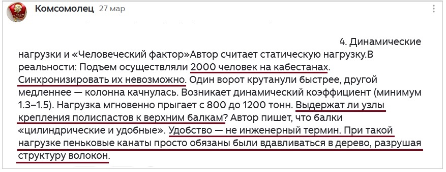 Не могли додуматься, что от надёжности и прочности лесов, канатов и петель из них зависит успех столь трудной операции.
