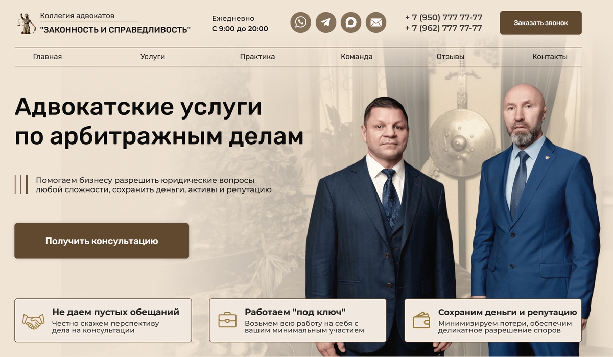 На сотрудничество к нам пришла Коллегия адвокатов "Законность и справедливость" в лице председателя коллегии - Зотова Эдуарда и его заместителя Андрея Владимировича с запросом масштабирования клиентов на юридические услуги. Провели диагностику текущей ситуации. Выяснили, что нет стабильного и понятного источника клиентов, люди приходят в основном по рекомендации, чего не хватает. Хотелось дальше расти и развиваться, но не было понятно как это сделать. У коллегии широкий спектр услуг - от семейных споров до уголовных дел. Поскольку мешать все в кучу и запускать на это траффик было бы не эффективно, мы разделили их направления услуг, для каждой из которых сделали посадочную страницу. Рекламу же решили запускать на направление арбитражных дел, поскольку оно было наиболее интересно для коллегии и, кроме того, очень выгодно, поскольку какая-то часть предпринимателей, после успешного решения их вопроса остается на постоянное обслуживание За счет того, что мы грамотно проработали целевую