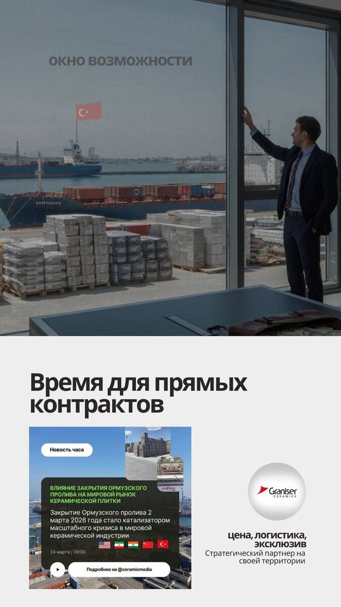 Прямой контракт обеспечивает лучшие оптовые цены, исключает посредников, гарантирует наличие товара и позволяет брендировать продукцию под собственные нужды. Основной производитель турецкого керамогранита, предлагающий сотрудничество: Graniser Seramik. На данный момент фабрика рассматривает прямых партнеров в РФ. Основные преимущества прямых контрактов (с фабриками/официальными дилерами): Цена: Отпускная цена производителя без наценок посредников (часто от объема). Логистика: Организация доставки по принципу FOB (срок общей поставки от 5-14 дней.) Помощь в организации поставок. Эксклюзив: Согласование специальных условий под конкретный регион. Ассортимент: Доступ к складским запасам и новинкам, разнообразие форматов и поверхностей. Время возможностей: Именно сейчас в связи с ситуацией в Иране, появляется уникальное окно возможностей для Турецких производителей. Как заключить контракт: Связаться с отделом продаж фабрики (или их официального представителя) через официальный сайт, или н