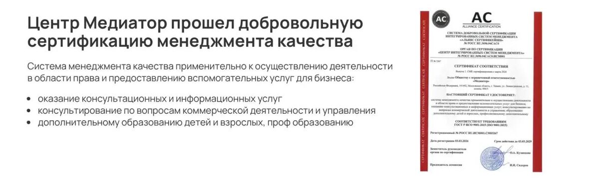 Центр Медиатор прошел добровольную сертификацию менеджмента качества