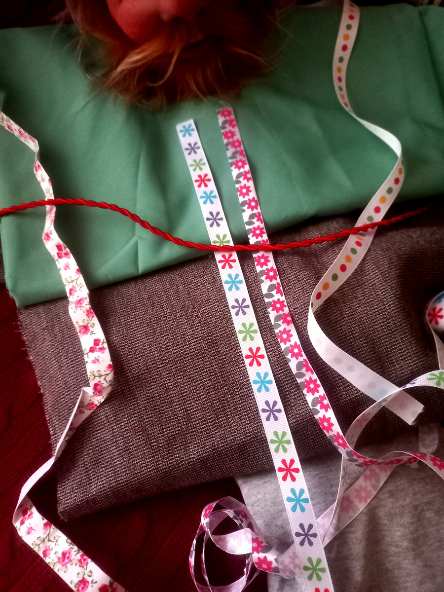 Выходные дни подарены рукоделию. Перевернуто некоторое количество тряпочек, которых у меня в закромах немерено. И , посоветовавшись с клиентом, пришли к выбору. Домовой будет иметь штанишки пестрые и зелёную рубаху, украшенную тесьмой.