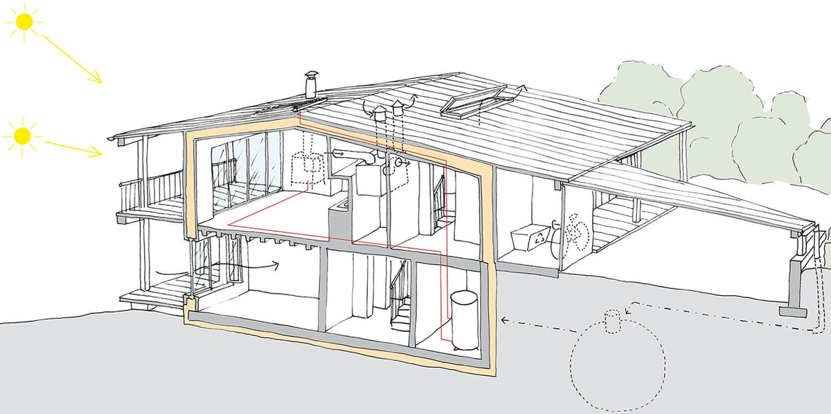 Пассивный дом — это не магический кристалл. Это просто очень хорошая теплоизоляция, герметичные окна, отсутствие мостиков холода и приточная вентиляция с рекуперацией (тепло от выходящего воздуха передаётся входящему). Зимой дом греют солнечные лучи, тепло от людей и бытовых приборов. Летом — защищают от перегрева козырьками и деревьями.