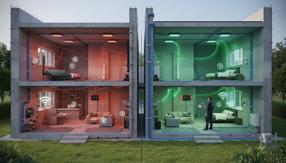 ? В монолите это редко работает: роутер «кричит» сильнее, но бетон с арматурой глушит сигнал; репитеры без общей схемы превращают сеть в лоскутное одеяло — устройства перескакивают между точками, появляются обрывы и лаги. Особенно неприятно, если в доме тёплые полы, камеры, умный дом и автоматика полива. Мы в Box House проектируем Wi‑Fi как инженерную систему — кабель, размещение точек, настройка и приоритеты трафика. Хотите чек‑лист? Пишите в Директ 👇🔧