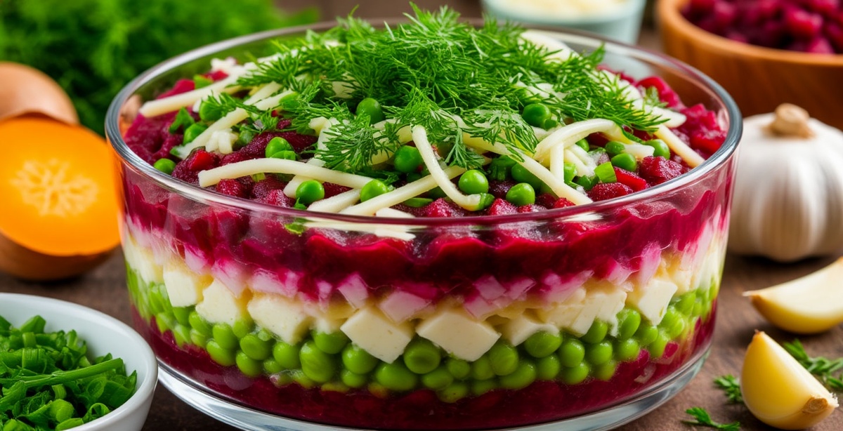 Этот салат — как магический плащ‑невидимка для занятой хозяйки: вы тратите всего 10 минут и используете простые продукты, а результат выглядит так, будто за кулисами работал целый ресторанный цех. Яркие цвета, гармоничные вкусы и всеобщее восхищение — без суеты, стресса и долгих часов у плиты. Сочетание здесь максимально удачное: сладковатая свёкла, солёные огурцы, нежные яйца, сыр и зелёный горошек. Всё знакомое, доступное и идеально сбалансированное по вкусу. При этом блюдо получается сытным, но не тяжёлым. Для приготовления берут отварную свёклу и яйца, маринованные огурцы, твёрдый сыр, консервированный зелёный горошек и немного чеснока. Вместо майонеза используют лёгкий соус на основе йогурта с добавлением зелени, горчицы и оливкового масла. Свёклу натирают на тёрке, добавляют чеснок, немного соуса и соль. Отдельно подготавливают сыр — его тоже натирают и смешивают с чесноком и соусом. Яйца измельчают таким же способом, добавляя немного заправки. Огурцы натирают отдельно и обязател
