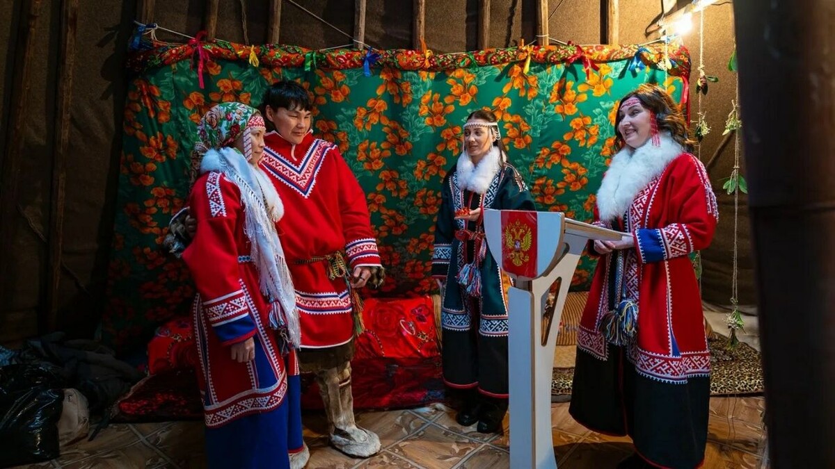 «Жених родом из Тазовского района, невеста — из Шурышкарского. Они познакомились в филиале Ямальского многопрофильного колледжа. Михаил впервые увидел Любовь в спортзале и сразу понял, что это его судьба. Он тренировал девушку, готовил к соревнованиям. Спорт стал для них общим делом и началом семейной истории», — рассказали в пресс-службе. Михаил — чемпион Ямала по армейскому рукопашному бою. Предложение он сделал на пьедестале, подарив невесте вместо кольца свою медаль. После окончания колледжа пара решила остаться жить в Лабытнанги, так как им очень нравится этот город. Перед регистрацией молодожены прошли национальный обряд с выкупом невесты и проходом под воротами Под-пя. Затем молодожены зашли в чум, где обменялись кольцами и зажгли очаг, бросив полено в печь. В этот праздничный день в Аксарке пройдут сразу три национальные свадьбы. Регистрацию организовали в чуме, оформленном в национальном колорите, с полным соблюдением традиционных свадебных обрядов.