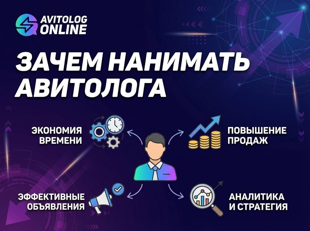 : ➕ Экономия времени и ресурсов. Авитолог уже знает, как правильно оформить объявление и настроить коммуникацию — вы делегируете рутину и освобождаете время для бизнеса. ⏳ 💸 Экономия денег. Специалист сокращает количество «тестовых» размещений и ненужных расходов на рекламу — меньше сливов бюджета. ⚡ Готовая рабочая стратегия. Авитолог приносит отлаженные схемы, благодаря которым лиды начинают конвертироваться быстрее. Это не просто тесты — это сразу результат. 📈 Ускорение генерирования прибыли. Меньше упущенной прибыли из‑за экспериментов: вы начинаете зарабатывать на поступающих лидах быстрее. ✅ Ясный ROI. Если сравнить расходы на специалиста и прирост дохода (и сэкономленные бюджеты на тесты), вывод почти всегда очевиден — нанимать выгодно. 😉 Вывод: авитолог — это инвестиция, которая экономит время и деньги и ускоряет выход на прибыль.