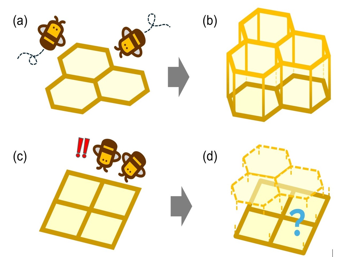 В этом исследовании авторы стремились выяснить способность пчел адаптироваться к чрезвычайно сильным нарушениям геометрии ячеек сотов. С этой целью медоносным пчелам были предоставлены листы вощины, состоящие из квадратных ячеек, и за их последующей деятельностью по строительству гнезд периодически наблюдали. Примечательно, что медоносные пчелы остро воспринимали размер и расположение квадратов, отпечатанных в основании вощины, и конструировали различные типы сот в зависимости от различий. Результаты этого исследования расширяют понимание механизмов, с помощью которых создаются шестиугольные соты высокого порядка.