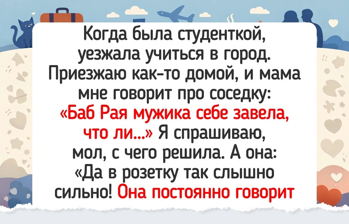 Когда была студенткой, уезжала учиться в город. Приезжаю как-то домой (у нас через стенку жила бабушка-соседка), и мама мне говорит: «Баб Рая мужика себе завела, что ли...» Я спрашиваю, мол, с чего решила. А она: «Да в розетку так слышно сильно!» Она постоянно: «Ах ты, Мишка-шалунишка!», и хохочет. Слышу — и правда, с Мишкой хохочет. А потом оказалось, что кота бабушка себе завела и Мишкой назвала. Алёна В. / Dzen