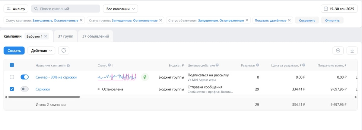 С Марией мы сотрудничаем с сентября 2025 года. Задача: "Привлечь новых клиентов на стрижки". Мария — парикмахер с огромным опытом. Она является частным мастером и сама осуществляет запись, а также поиск клиентов. Стоимость стрижки — 3000 руб. Это достаточно высокая цена даже для Санкт-Петербурга, учитывая высокую конкуренцию в данном городе. Этот момент имеет большое значение, и мы его учли, поскольку неправильные настройки рекламы могут существенно увеличить стоимость за обращение. 1. Проанализировали конкурентов и их предложения на рынке в текущем времени. 1. Протестировали более 35 объявлений за 2 недели. Мы столкнулись с проблемой низкой конверсии из обращения в запись. Многие клиенты писали, что сохраняют информацию «на потом». Это был серьезный момент, потому что на этом этапе мы теряли потенциальных клиентов. Чтобы исправить ситуацию, мы подключили инструмент «Рассылки», который помогает прогревать аудиторию и повышать конверсию. Для наших клиентов мы оплачиваем расход по тарифа