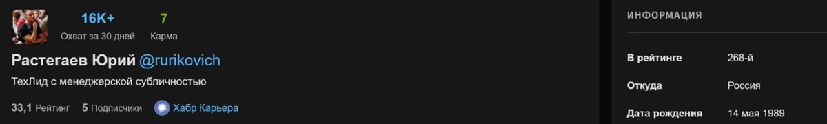 , чтобы поддерживать в себе уверенность в способность дойти до большой цели ! Последняя статья оказалась достаточно успешной. Она набрала 15 плюсов, подняв мой рейтинг на Habr'e до 33.1 и закинув меня аж на 268ое место. До этого был на 1200'ом месте. К слову рейтинг на хабре подвижный и со временем меняется, поэтому даже через час он может стать немного или много другим. Пока мы спим, кто то жадно читает и пишет статьи :) https://habr.com/ru/articles/1013924/ Спасибо всем, кто поддержал статью !
